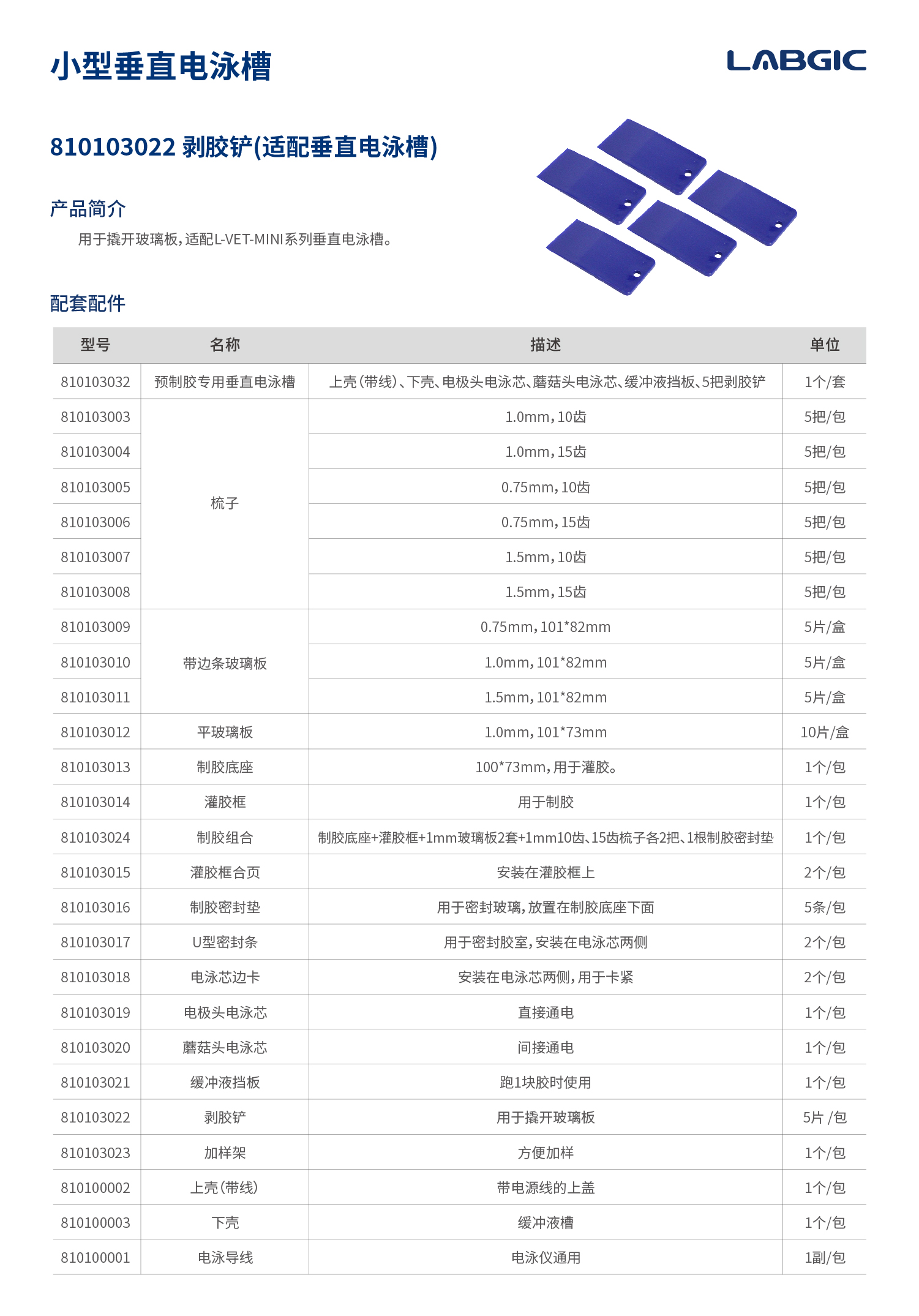 制胶底座+灌胶框+1mm玻璃板2套+1mm10齿、15齿梳子各2把、1根制胶密封垫。 |