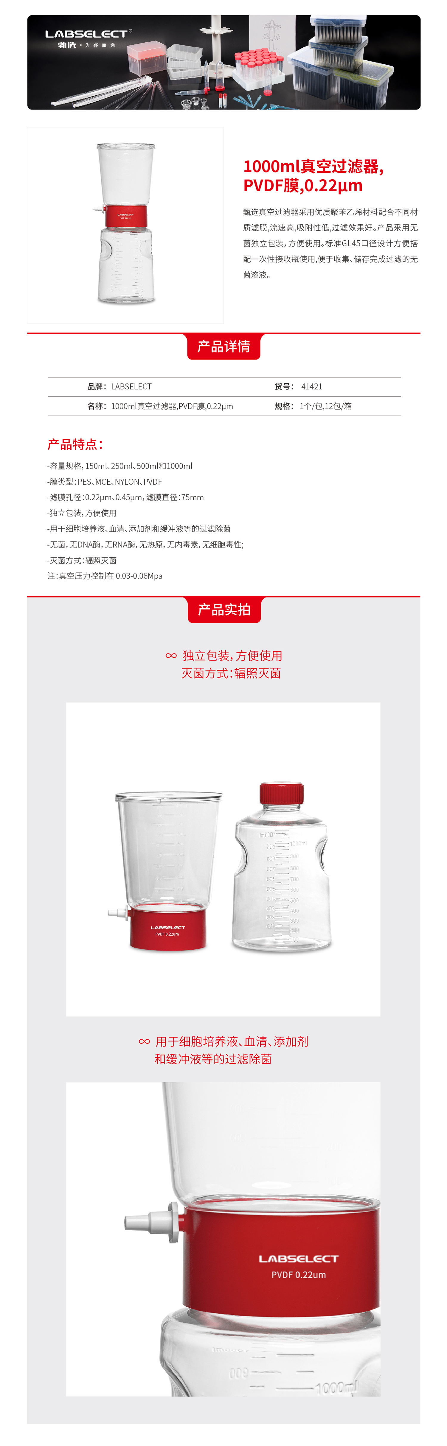 41421 1000mL真空过滤器,PVDF膜,0.22μm