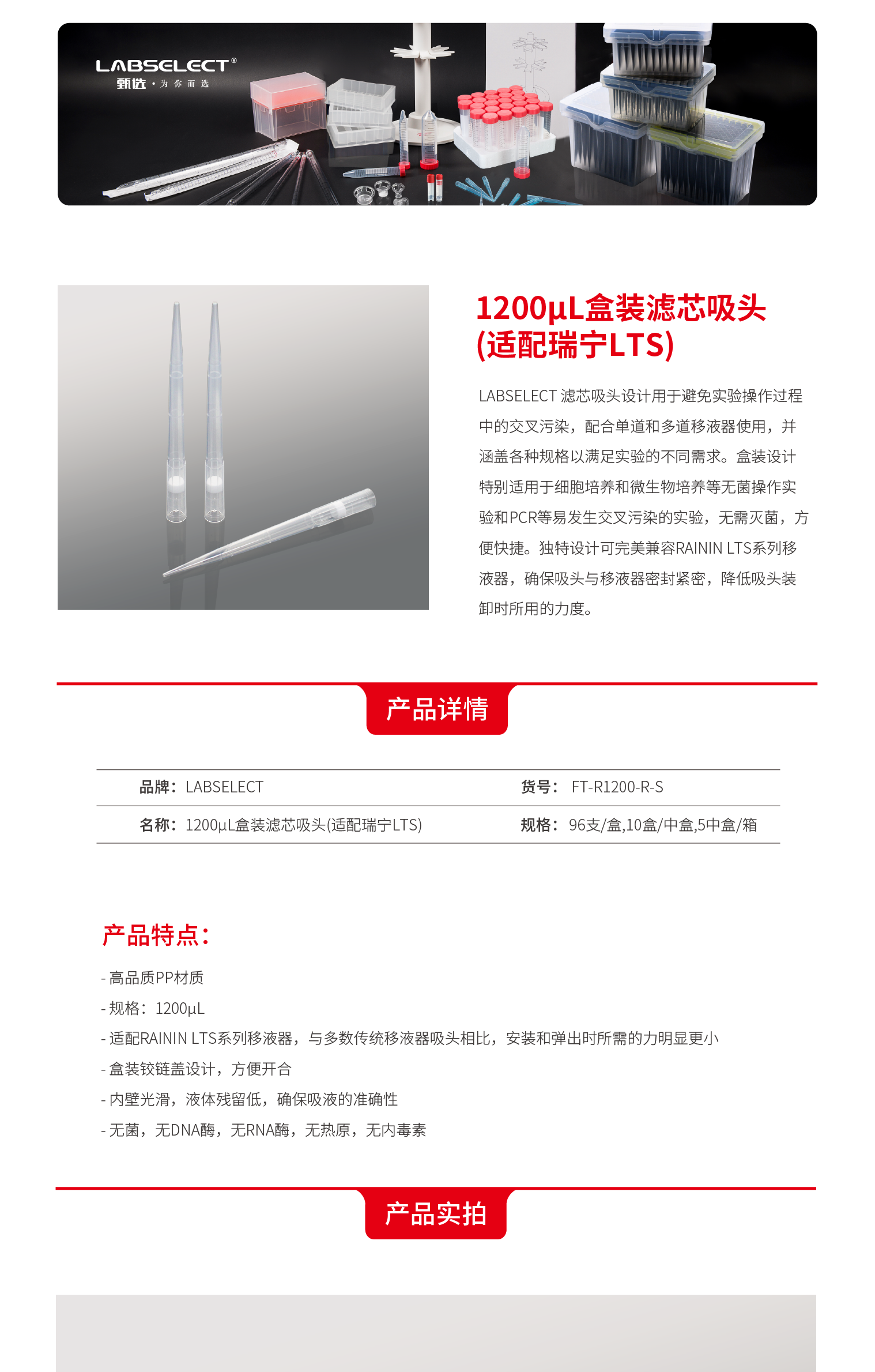 FT-R1200-R-S 1200μL盒装滤芯吸头(适配瑞宁LTS)