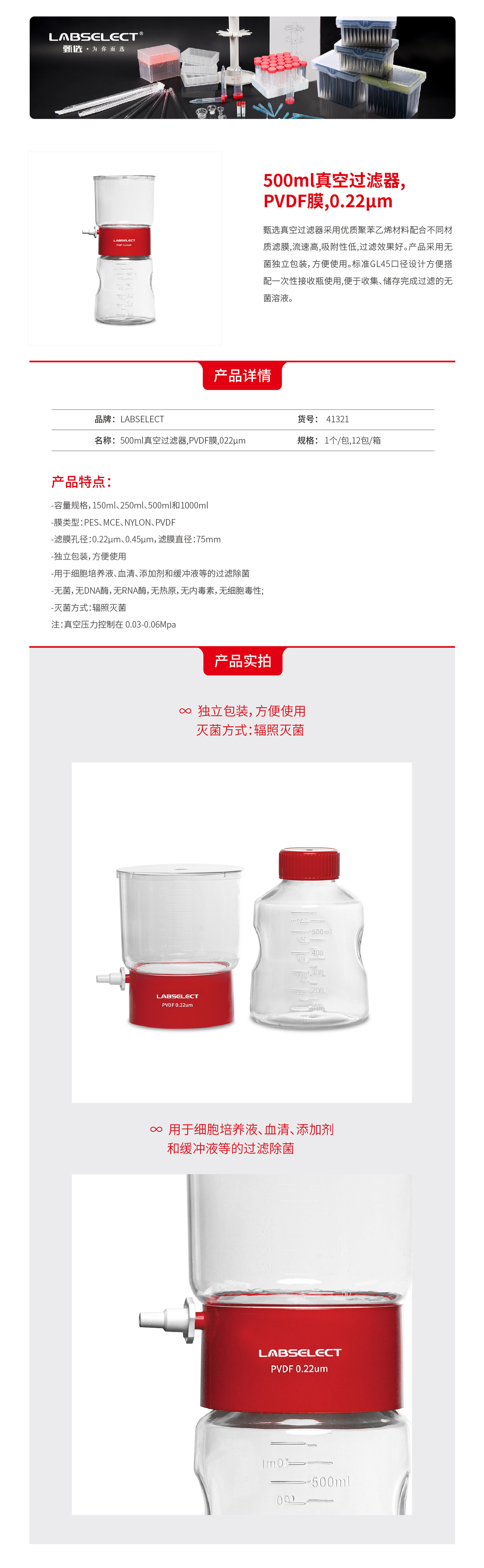 41321 500mL真空过滤器,PVDF膜,0.22μm
