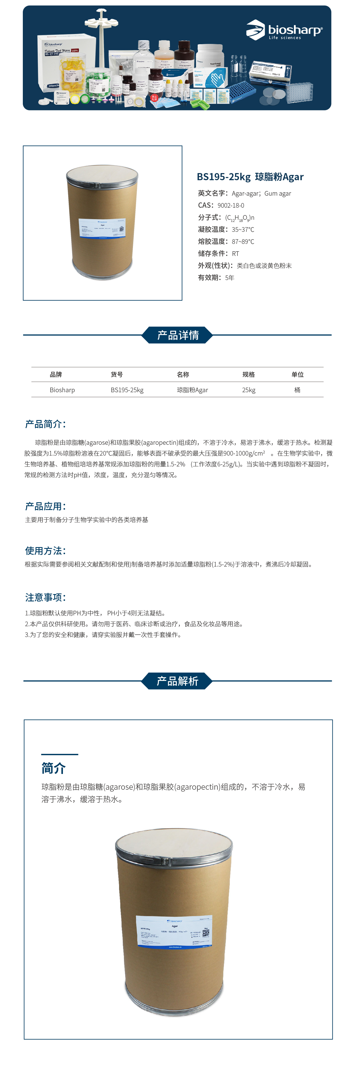 琼脂粉是由琼脂糖(agarose)和琼脂果胶(agaropectin)组成的,不溶于冷水,易溶于沸水,缓溶于热水。检测凝胶强度为1.5% 琼脂粉溶液在20℃凝固后,能够表面不破承受的最大压强是900-1000g/cm2。在生物学实验中,微生物培养基、植物组培培养基常规添加琼脂粉的用量1.5-2%(工作浓度6-25g/L)。当实验中遇到琼脂粉不凝固时,常规的检测方法时 pH 值,浓度,温度,充分混匀等情况。