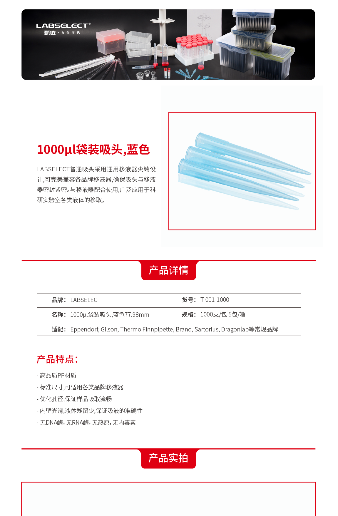 T-001-1000 1000μL袋装吸头,蓝色77.98mm
