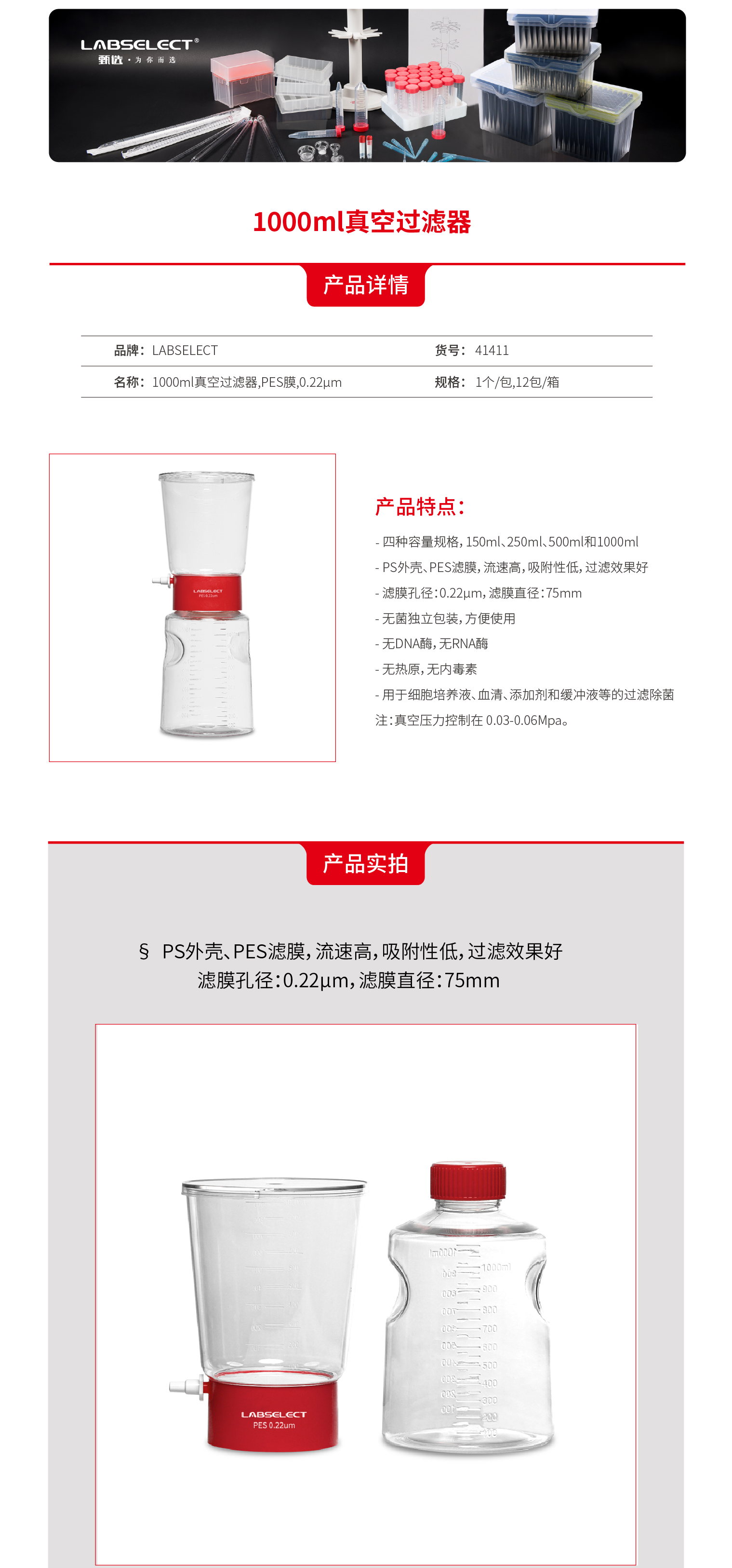 41411 1000mL真空过滤器,PES膜,0.22μm