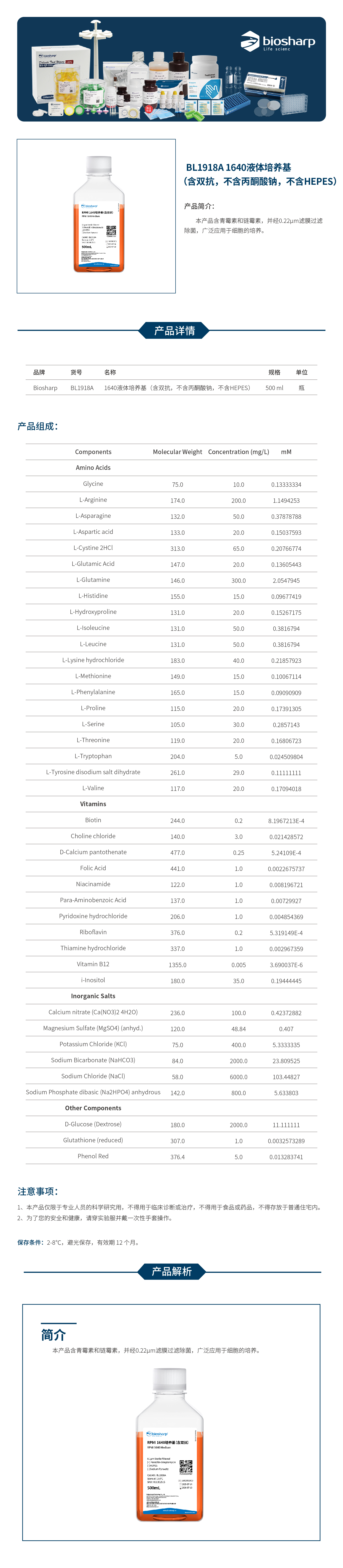 BL1918A 1640液体培养基(含双抗,不含丙酮酸钠,不含HEPES)