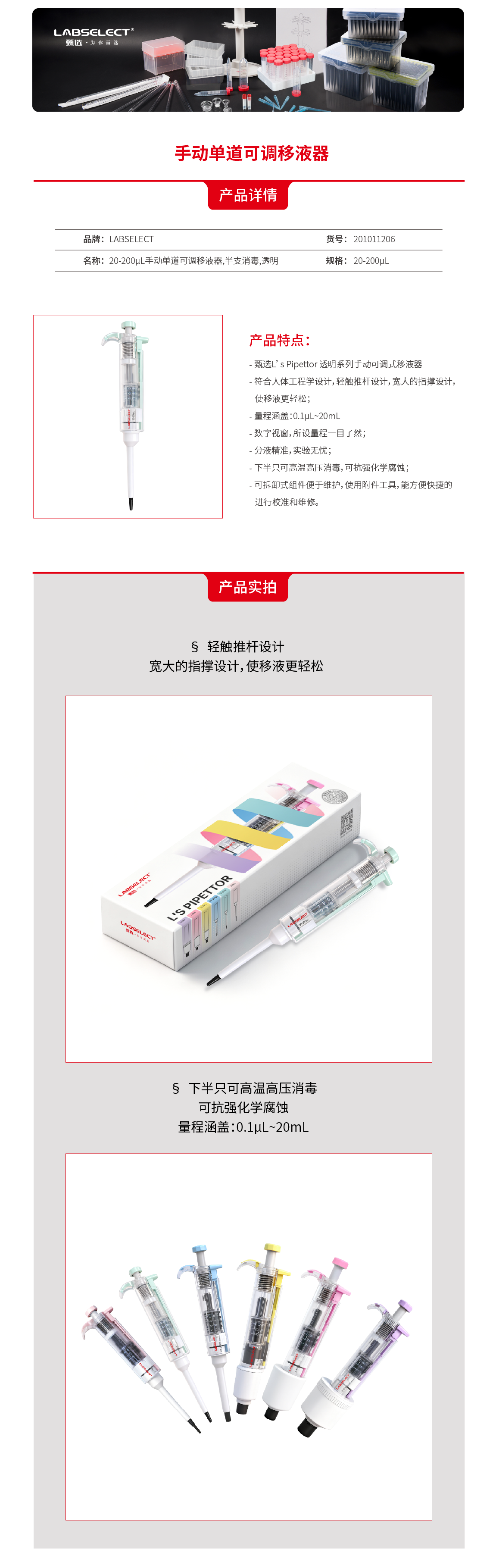 201011206 20-200μL手动单道可调移液器,半支消毒,透明