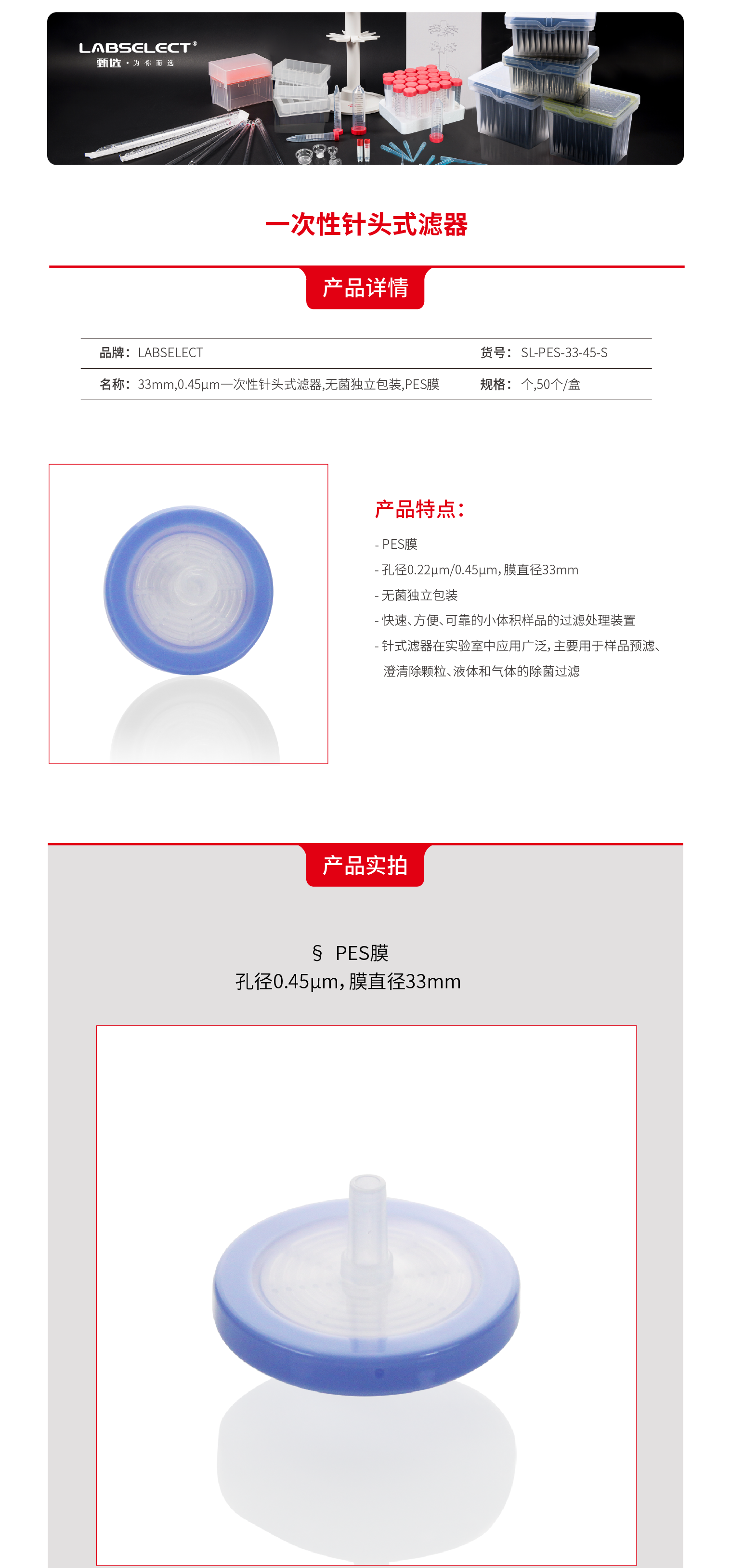 SL-PES-33-45-S 33mm,0.45μm一次性针头式滤器,无菌独立包装,PES膜