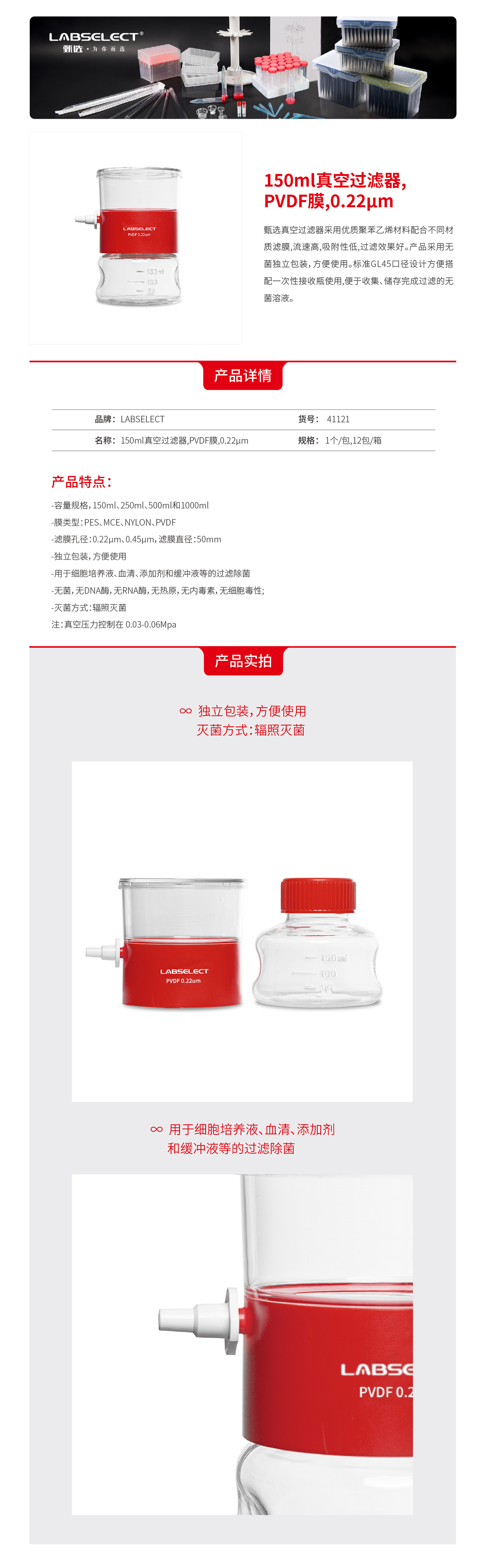 41121 150mL真空过滤器,PVDF膜,0.22μm
