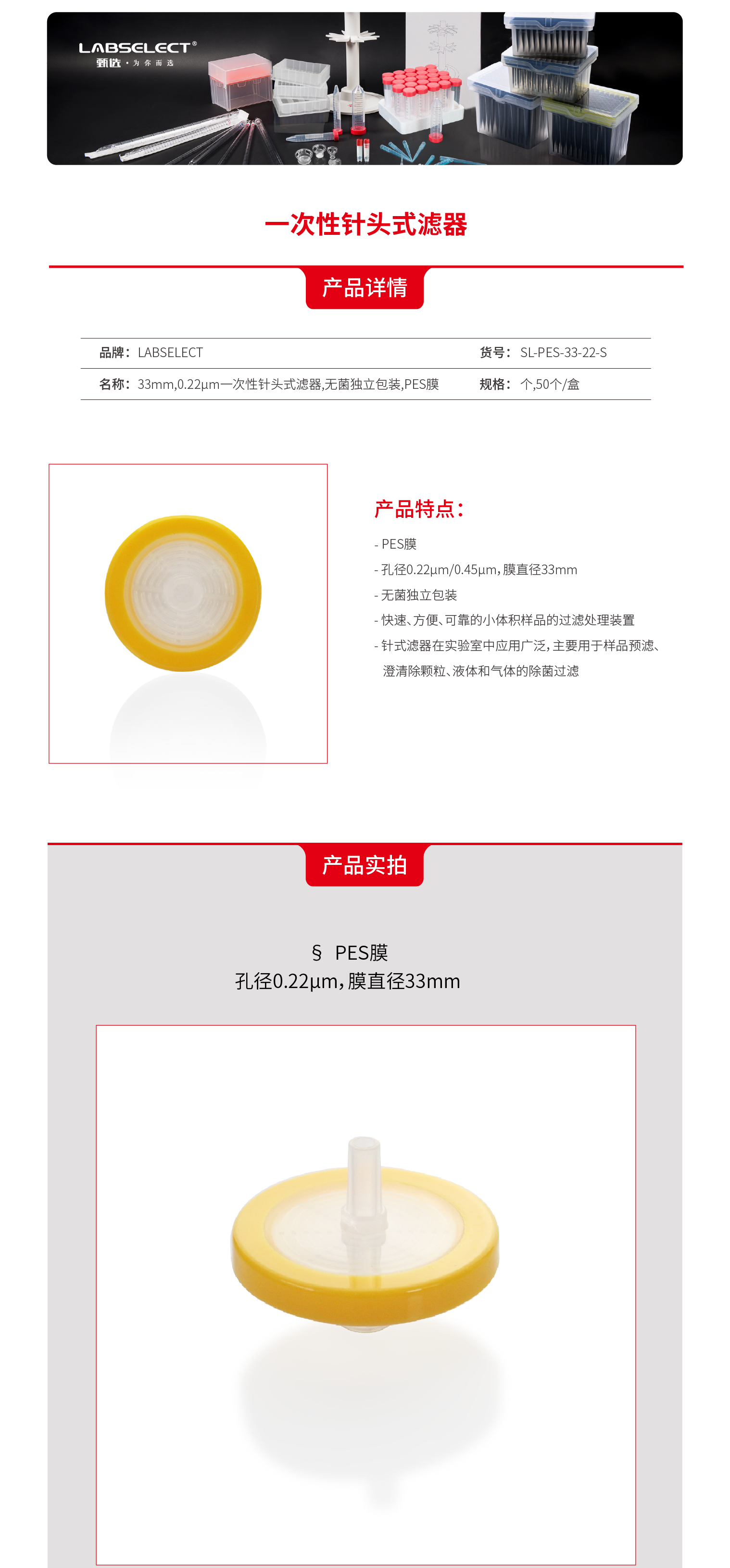 SL-PES-33-22-S 33mm,0.22μm一次性针头式滤器,无菌独立包装,PES膜