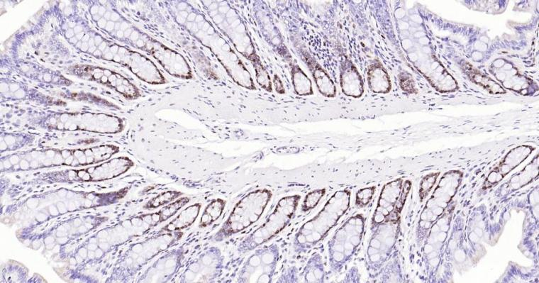 Paraformaldehyde-fixed, paraffin embedded Rat Colon; Primary:PCNA(Nuclear Loading Control) Mouse mAb (BOAM-00002) at 1/200 dilution; followed by conjugation to the HRP Detection System (Mouse) and DAB staining.