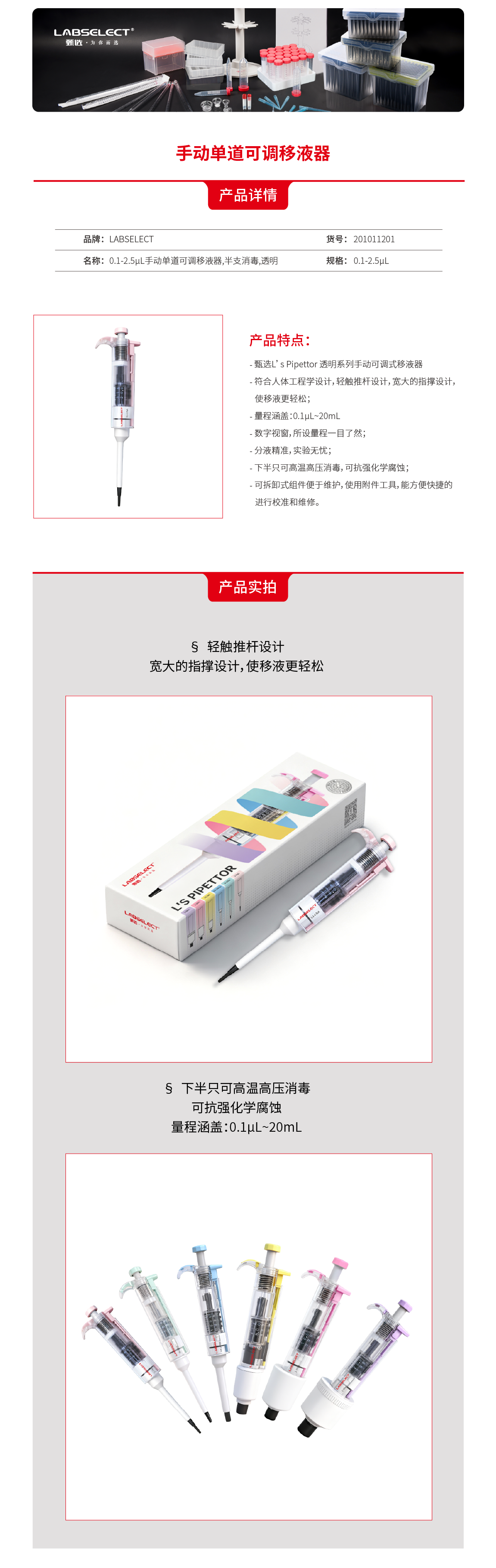 201011201 0.1-2.5μL手动单道可调移液器,半支消毒,透明