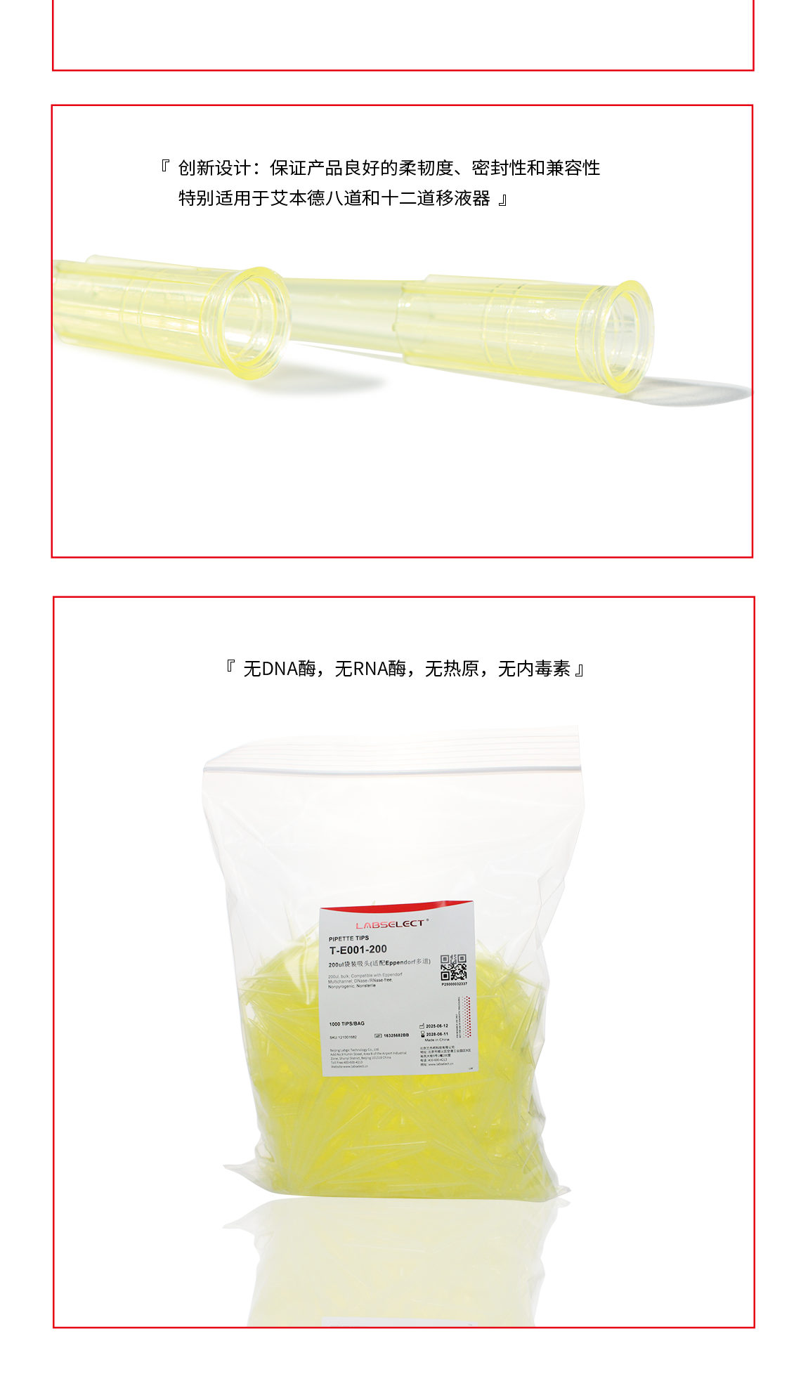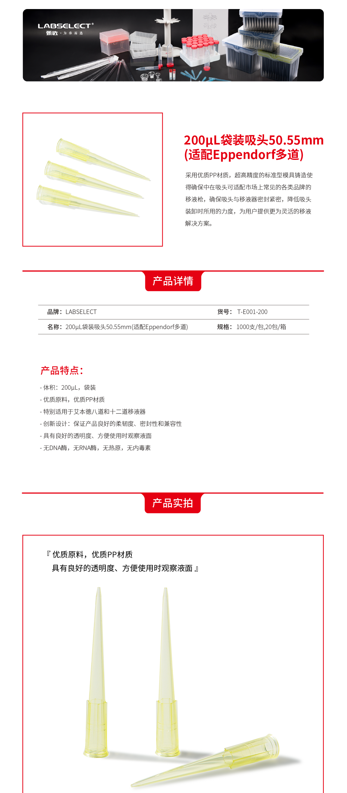 T-E001-200 200μL袋装吸头50.55mm(适配Eppendorf多道)