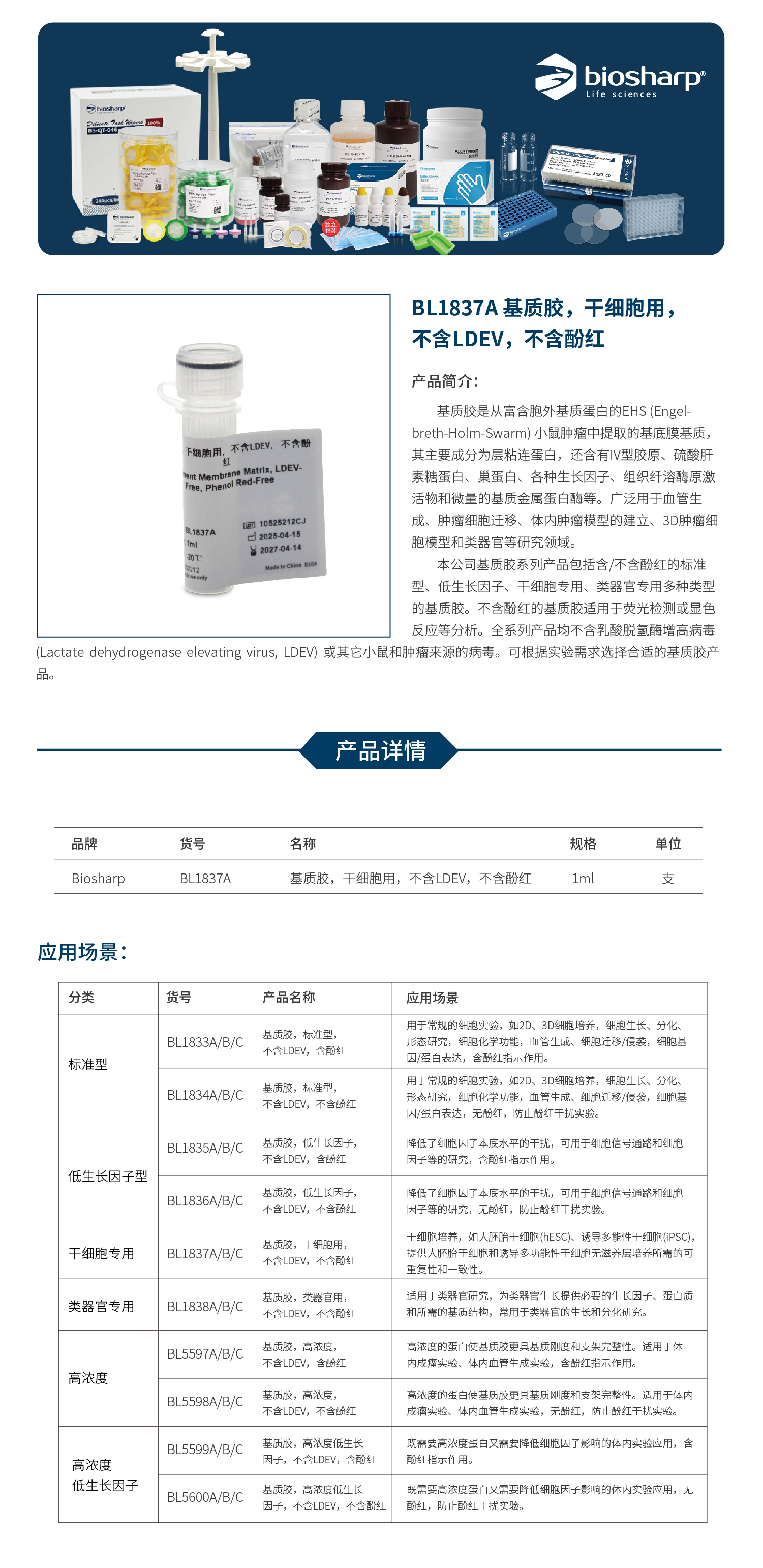 BL1837A 基质胶,干细胞用,不含LDEV,不含酚红