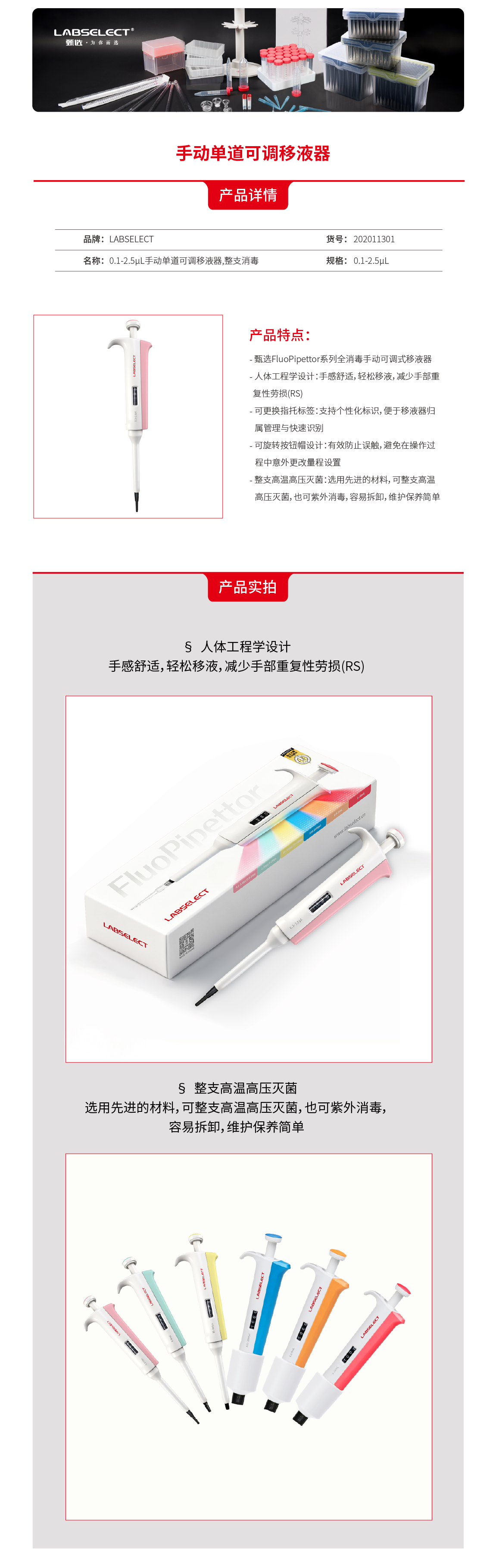 202011301 0.1-2.5μL手动单道可调移液器,整支消毒