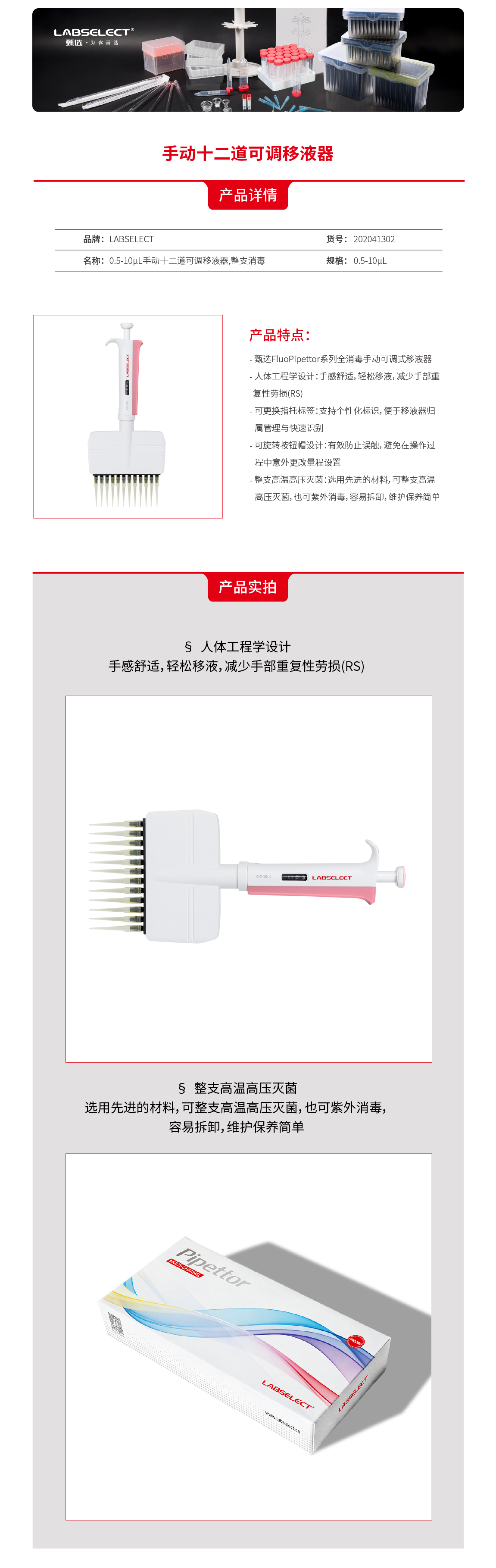 202041302 0.5-10μL手动十二道可调移液器,整支消毒