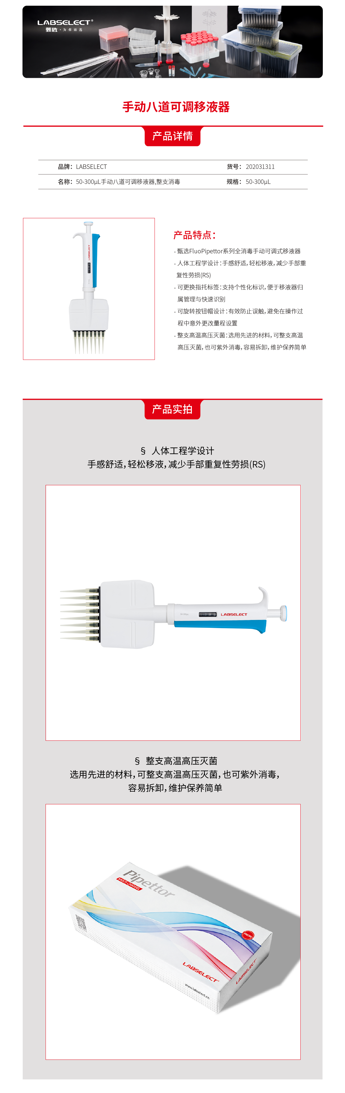 202031311 50-300μL手动八道可调移液器,整支消毒